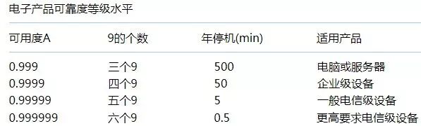 对电子产品而言,常用可用度n个9来描述产品可靠性水平。n个9表示在1年运行中,系统正常使用时间与总时间之比。